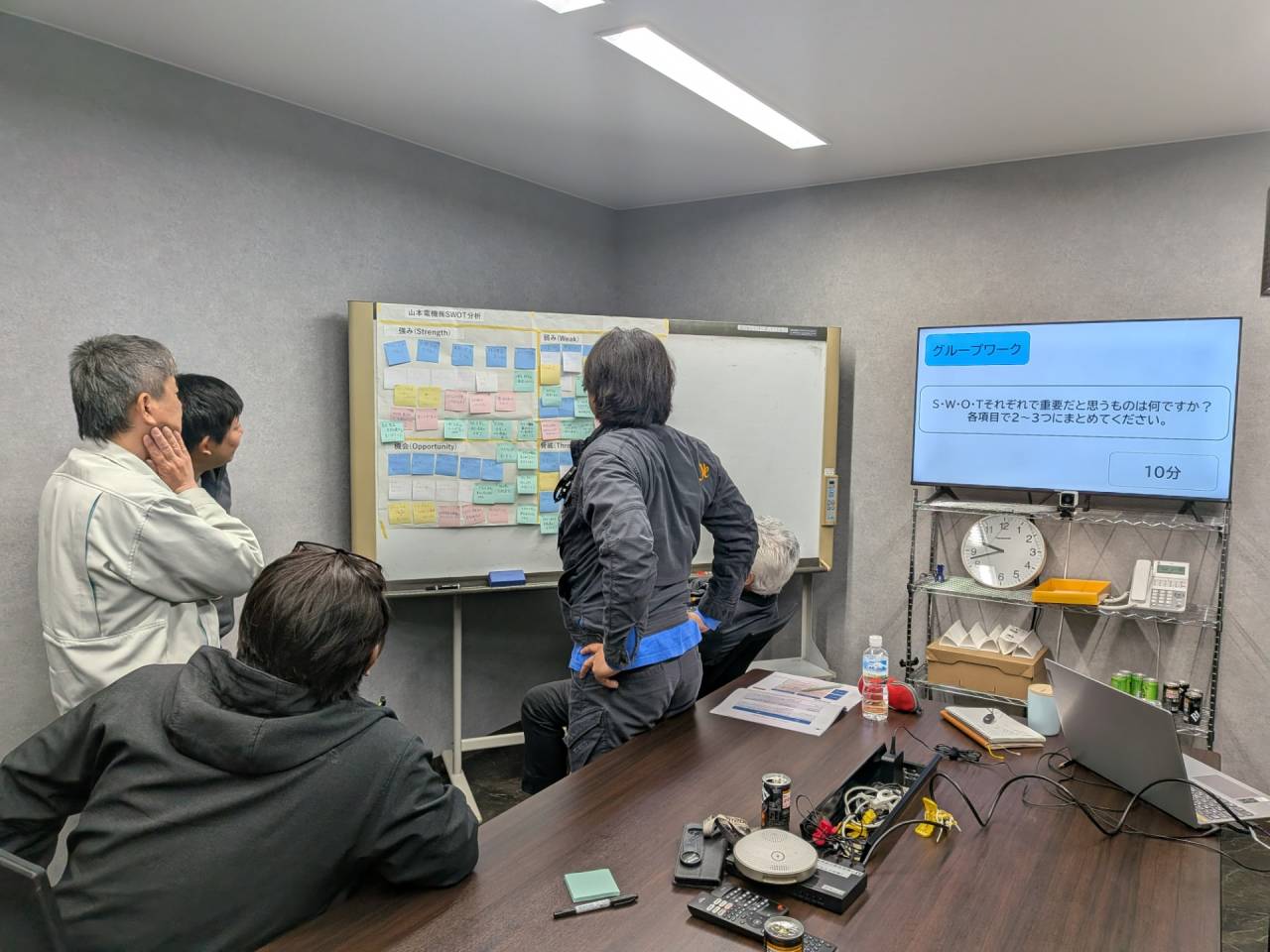 SWOT分析 2026/04/09 SWOT分析 社員と一緒に 社内で自社のSWOT分析を行いました。 今回は役付き社員チームと一般社員チームに分かれて実施しました。 どちらのチームをたくさんの意見が出て、とても盛り上がりました! 「楽しかった」「いろいろな意見が聞けて良かった」「自社への理解が深まった」など好意的な感想をたくさんいただきました。 今度は他のフレームワークにも挑戦したいですね。